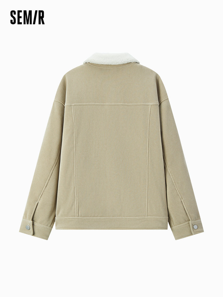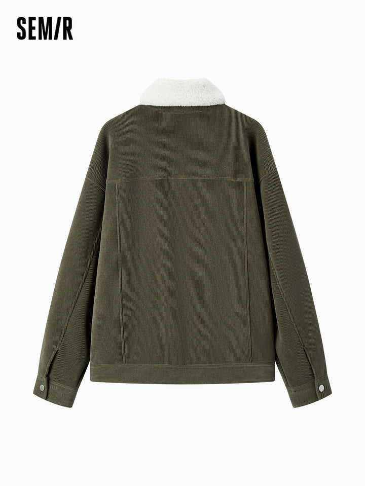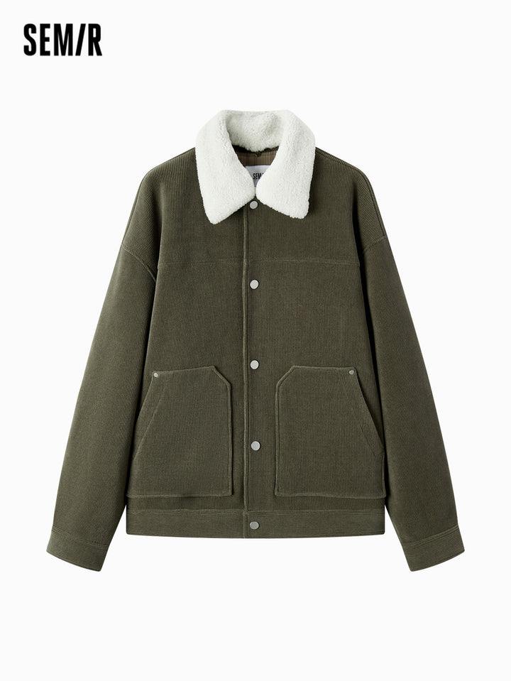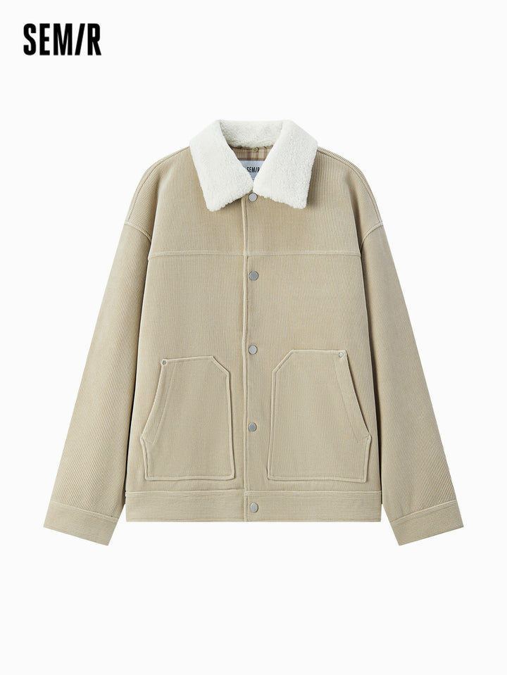 1. Made from 490g vertical chenille composite island fleece, plush textured rib surface, comfortable to touch; 2. Slightly loose silhouette, set-in shoulders, simple large pockets, detachable lamb fleece collar for versatile styling and warmth; 3. Soft and understated colors show quality, contrasting fur collar enhances style and sophistication