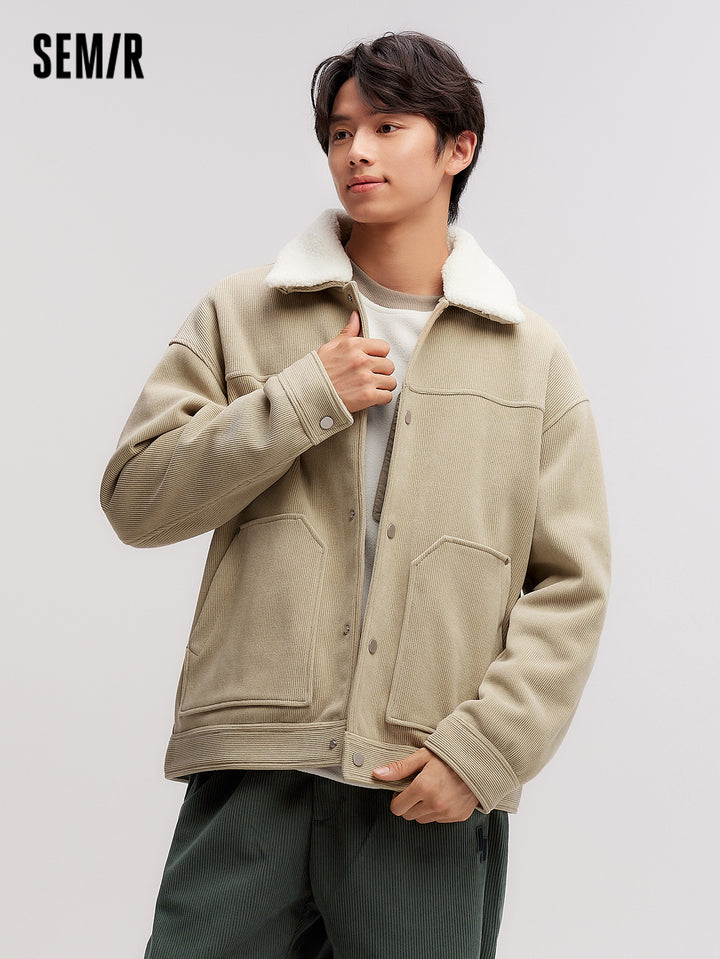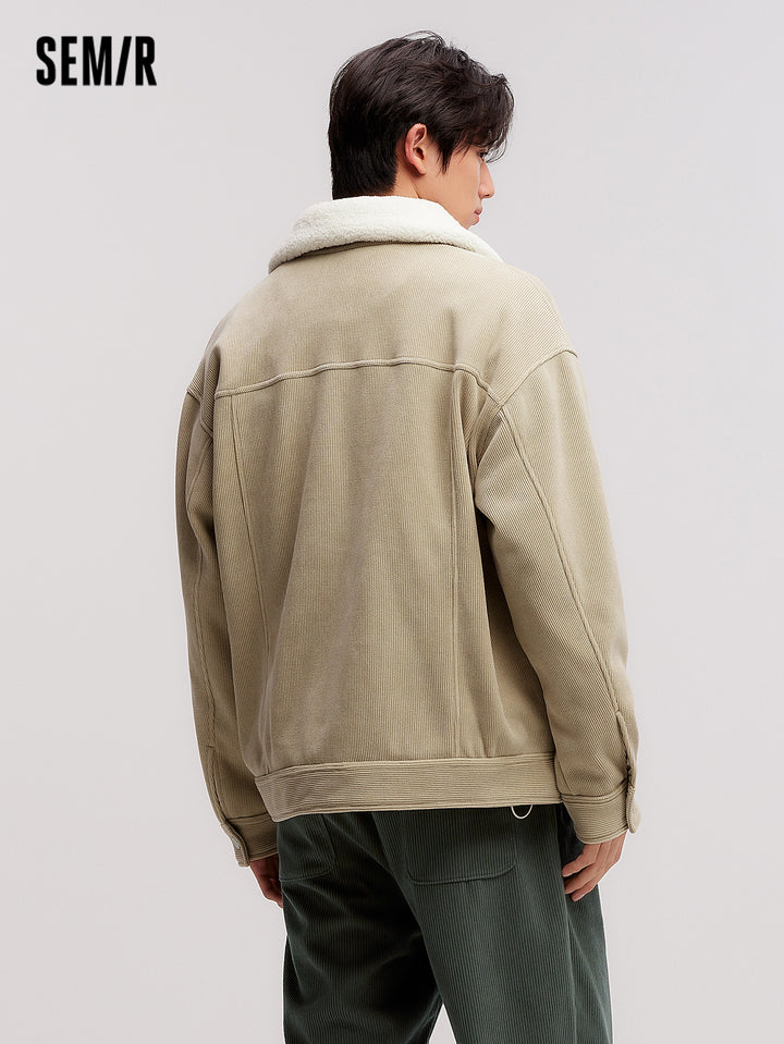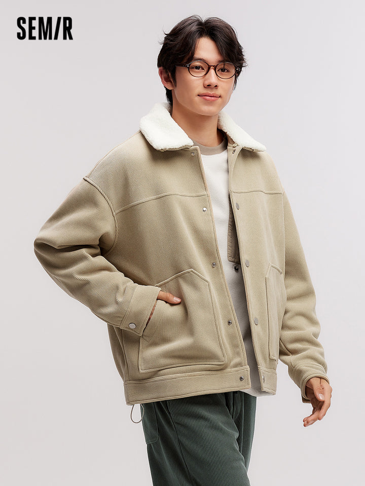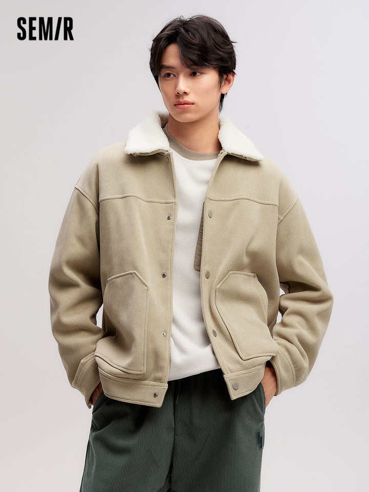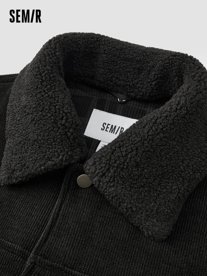 1. Made from 490g vertical chenille composite island fleece, plush textured rib surface, comfortable to touch; 2. Slightly loose silhouette, set-in shoulders, simple large pockets, detachable lamb fleece collar for versatile styling and warmth; 3. Soft and understated colors show quality, contrasting fur collar enhances style and sophistication