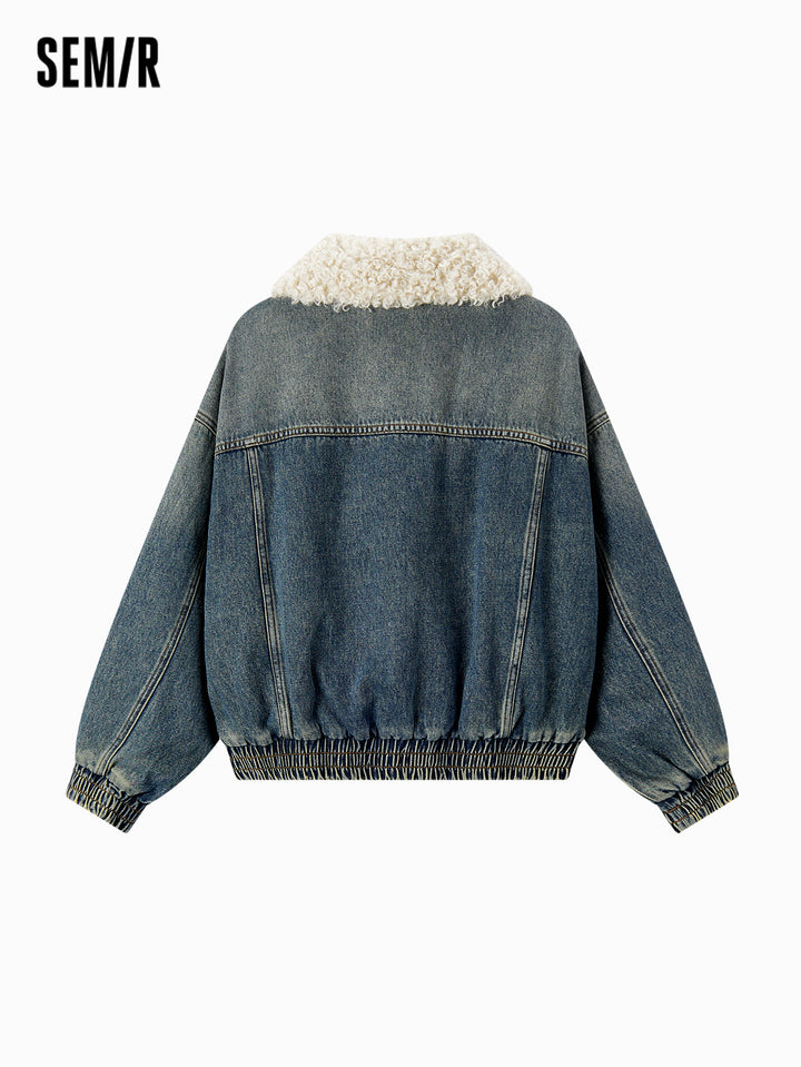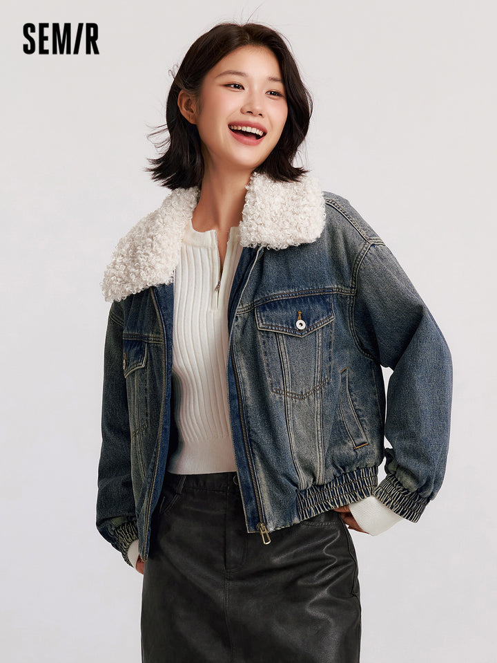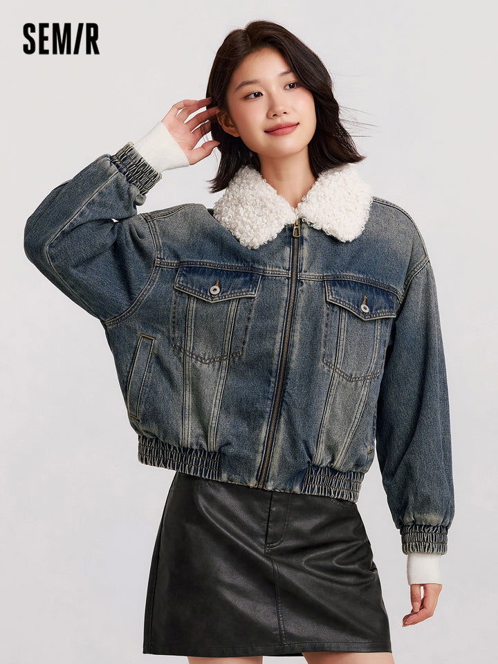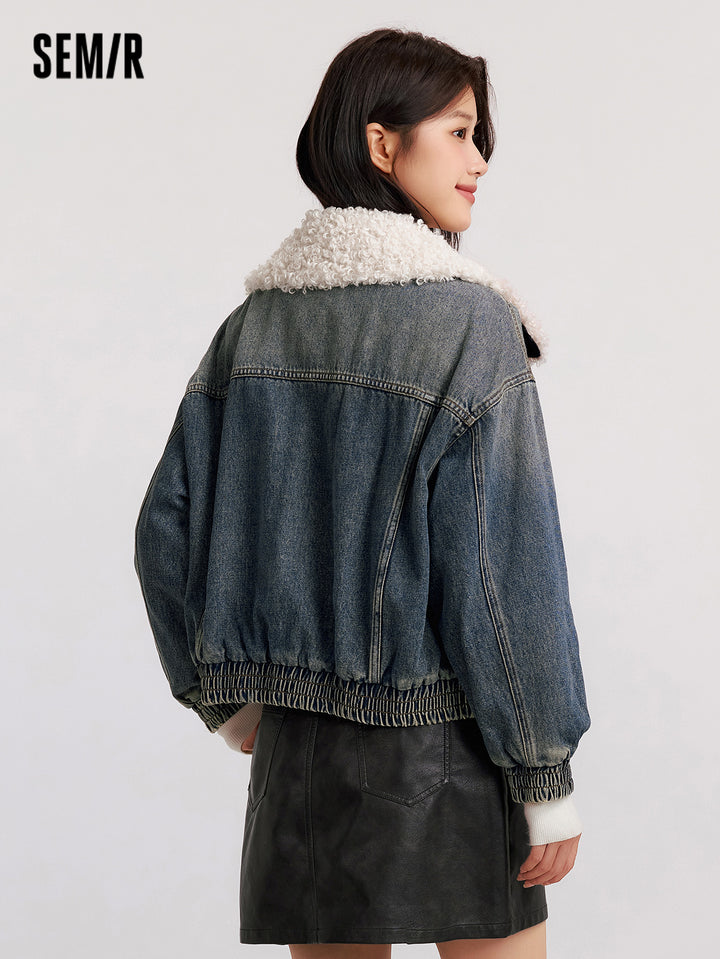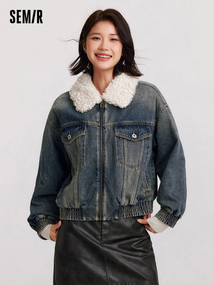 Fabric: Denim + chenille plaid; Wash: Vintage blue wash; Fit: Short retro biker jacket; Function: None; Details: Soft faux shearling collar, feminine; zipper placket; cocoon silhouette; Others: Flattering for all body types, elongates legs