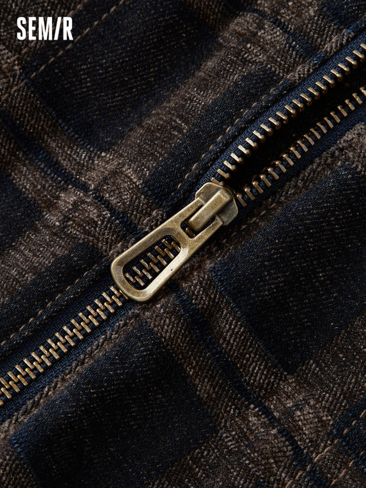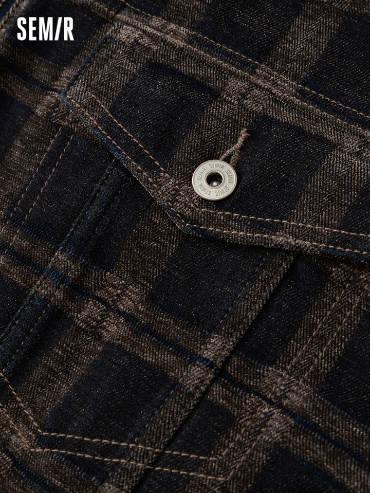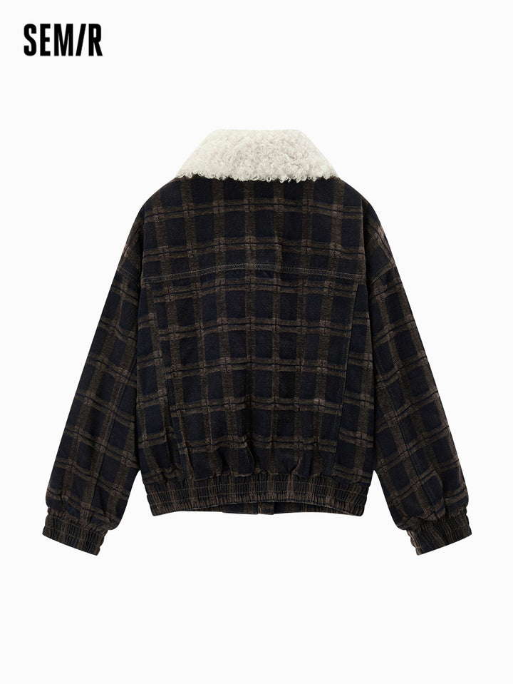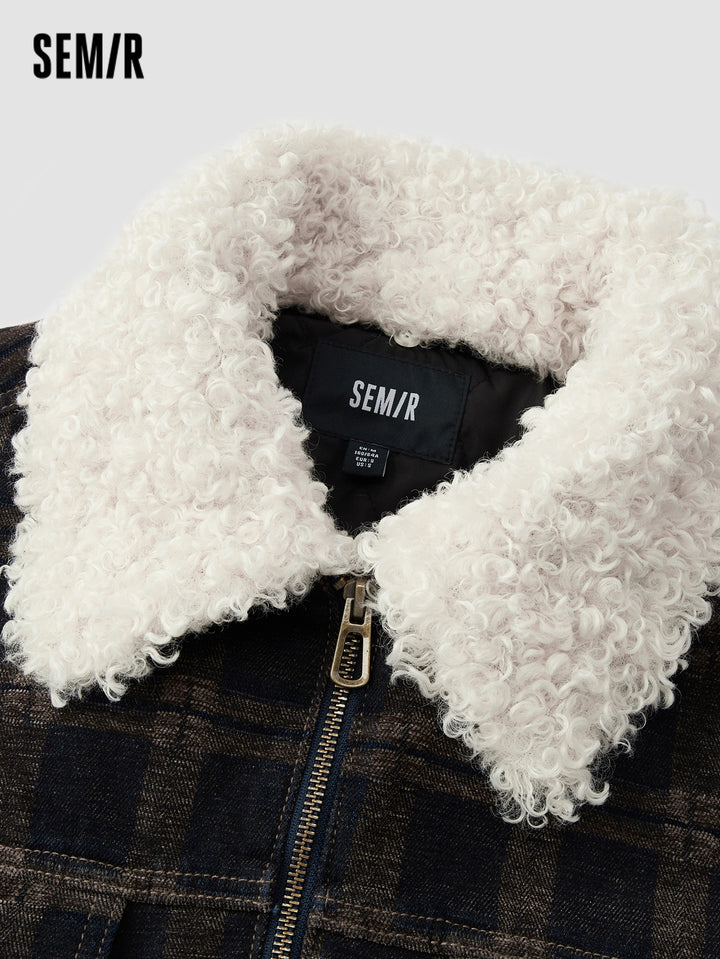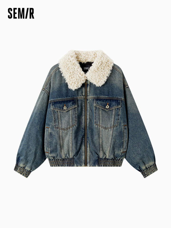 Fabric: Denim + chenille plaid; Wash: Vintage blue wash; Fit: Short retro biker jacket; Function: None; Details: Soft faux shearling collar, feminine; zipper placket; cocoon silhouette; Others: Flattering for all body types, elongates legs