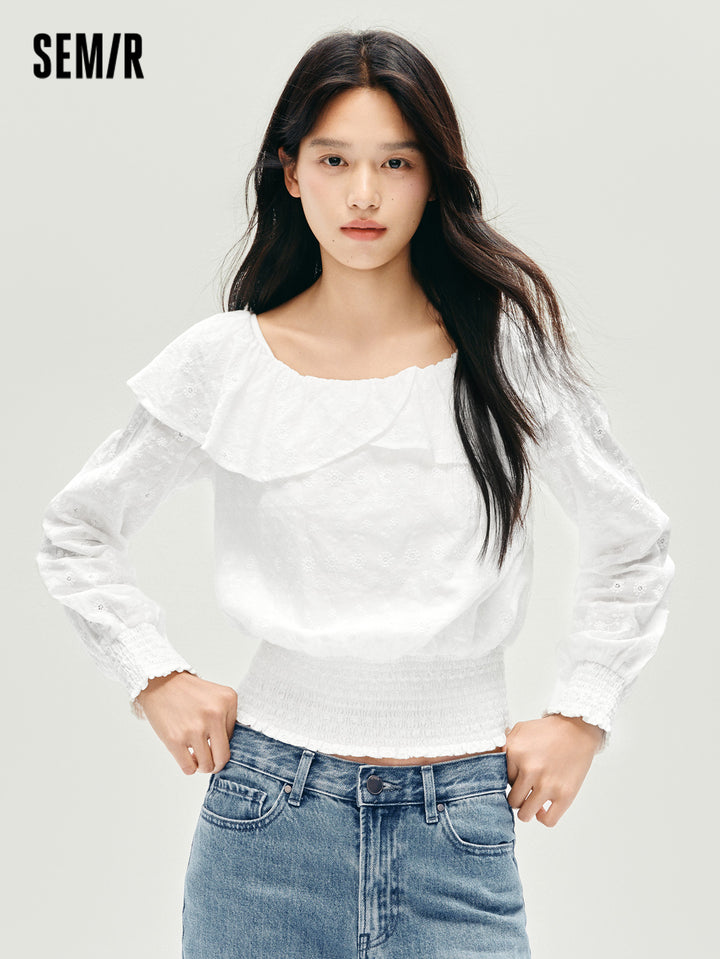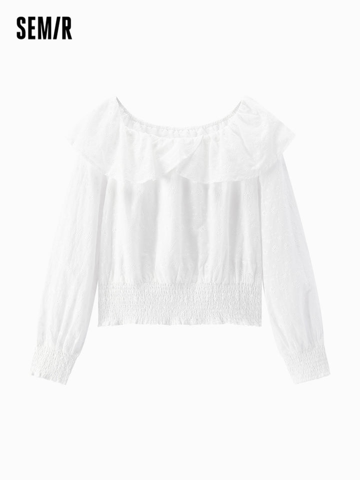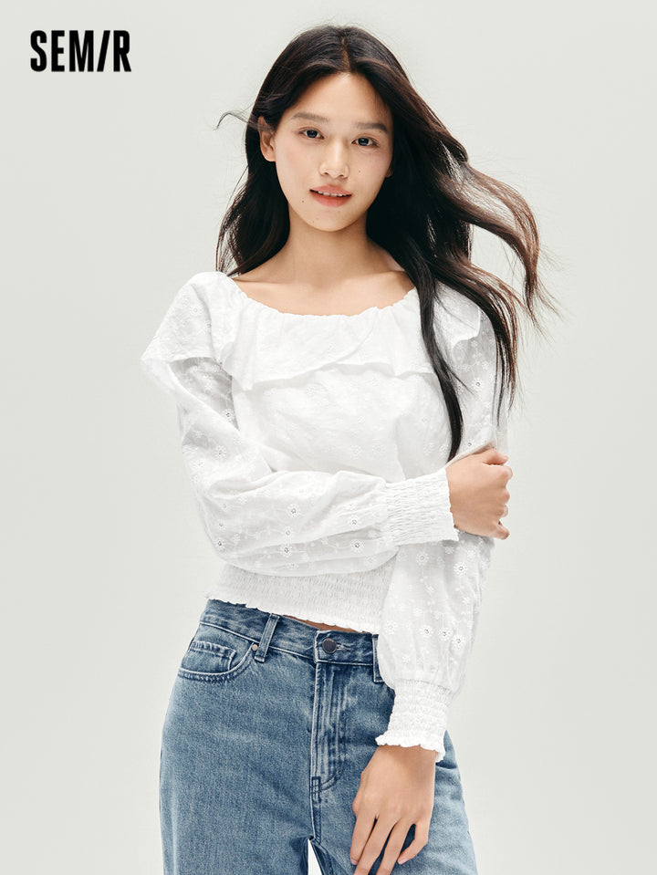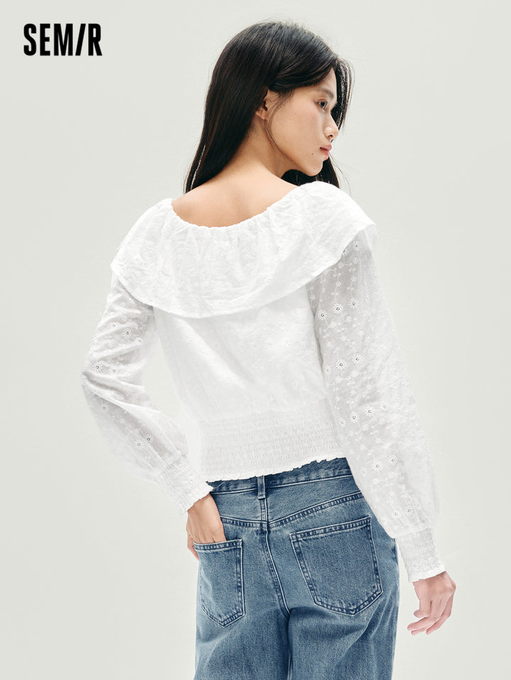 Ruffle off-shoulder blouse; 1. Wide romantic ruffle neckline, shapes figure and adds romance; 2. Off-shoulder trendy styling; 3. Smocked hem accentuates slim waist; 4. Eyelet embroidery fabric, breathable and unique.