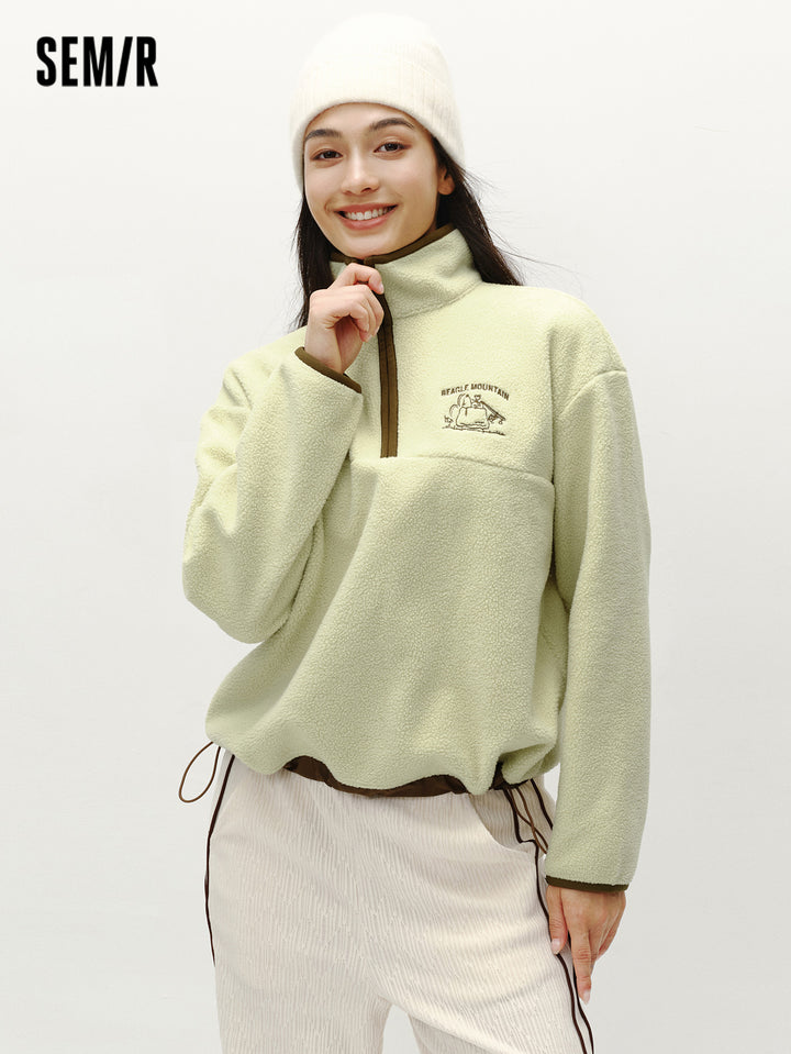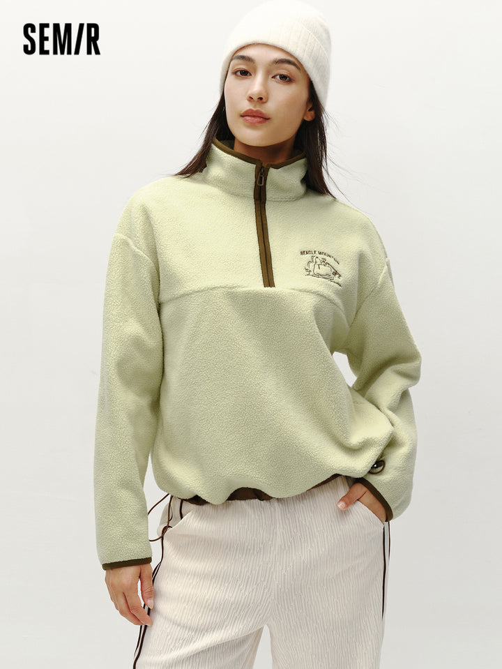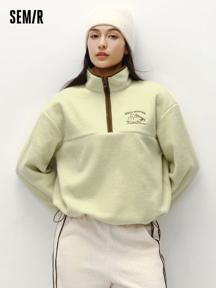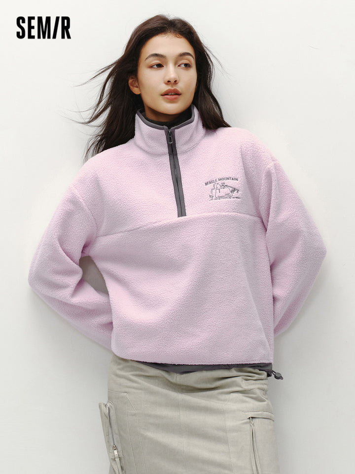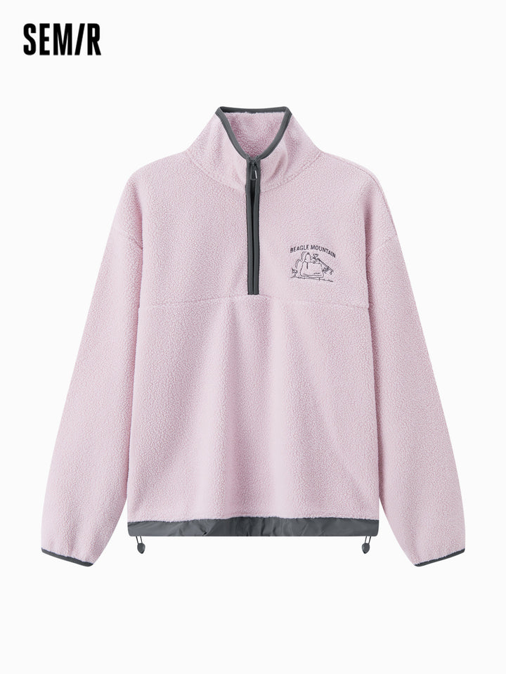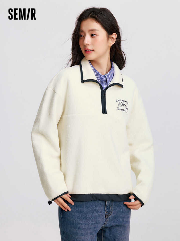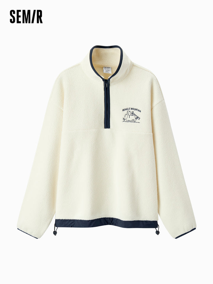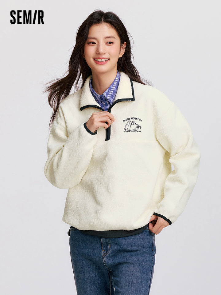 1. Easy-wear half-zip stand collar sweatshirt, delicate contrast piping and woven hem details, every detail thoughtfully designed; 2. Left chest Snoopy embroidery with fine stitching, playful and refined; 3. Slightly loose basic fit, mid-thigh length offers excellent coverage