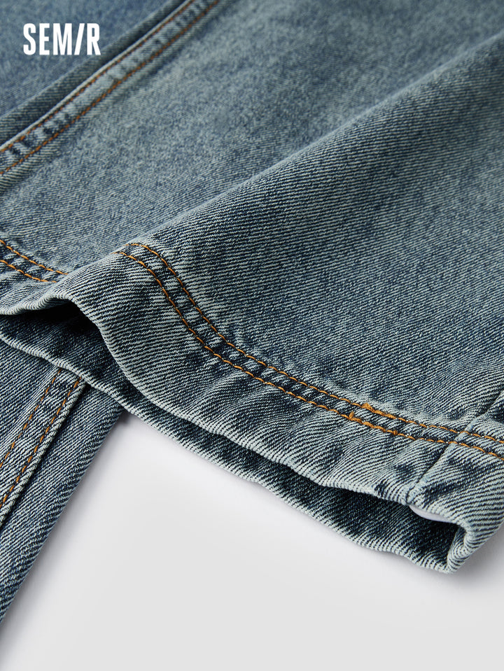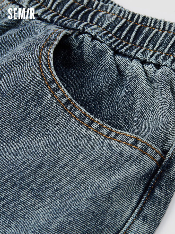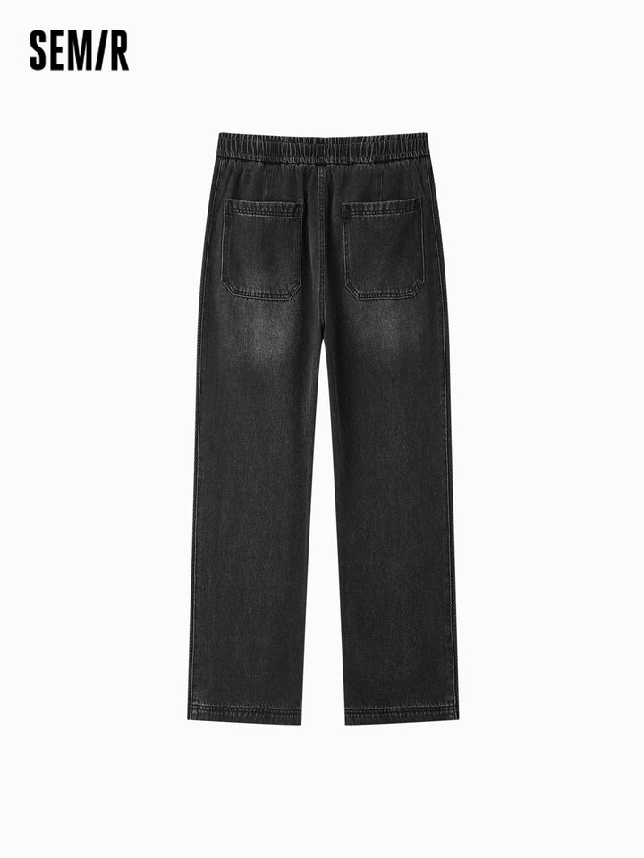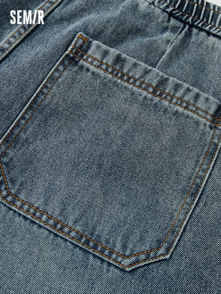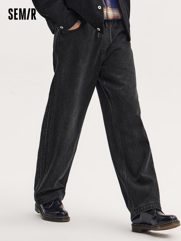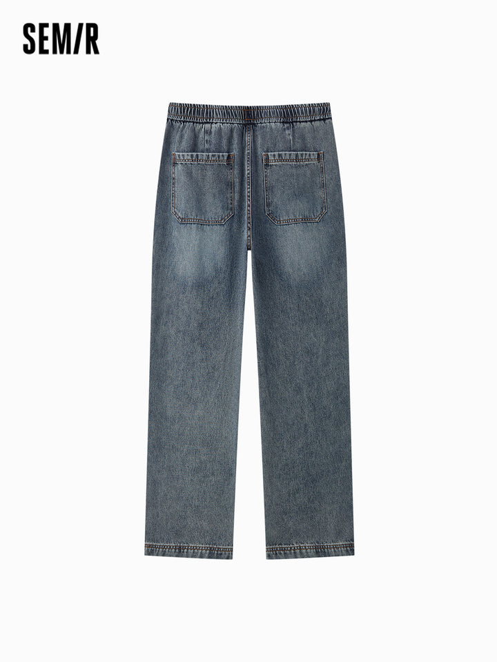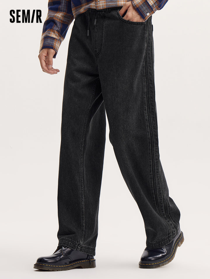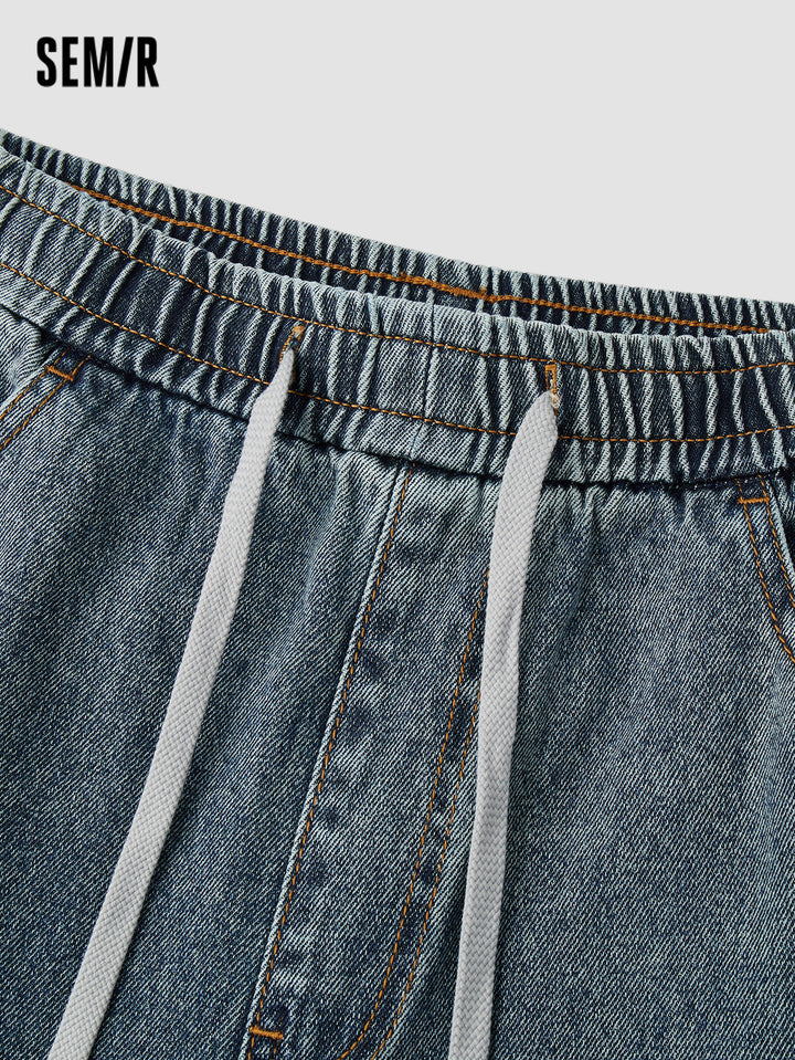 Fabric: soft cotton-lai cell vintage denim; Wash: yellow-dye; Fit: loose jogger pants; Function: none; Details: side stripe design, adjustable hem, inner waistband drawstring