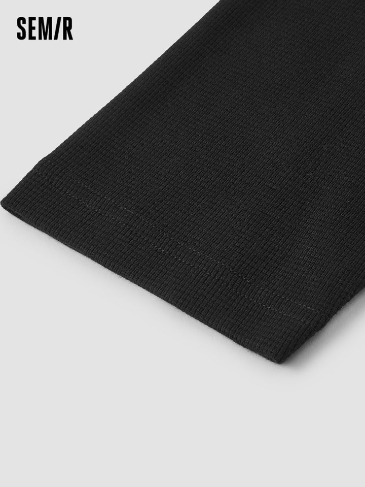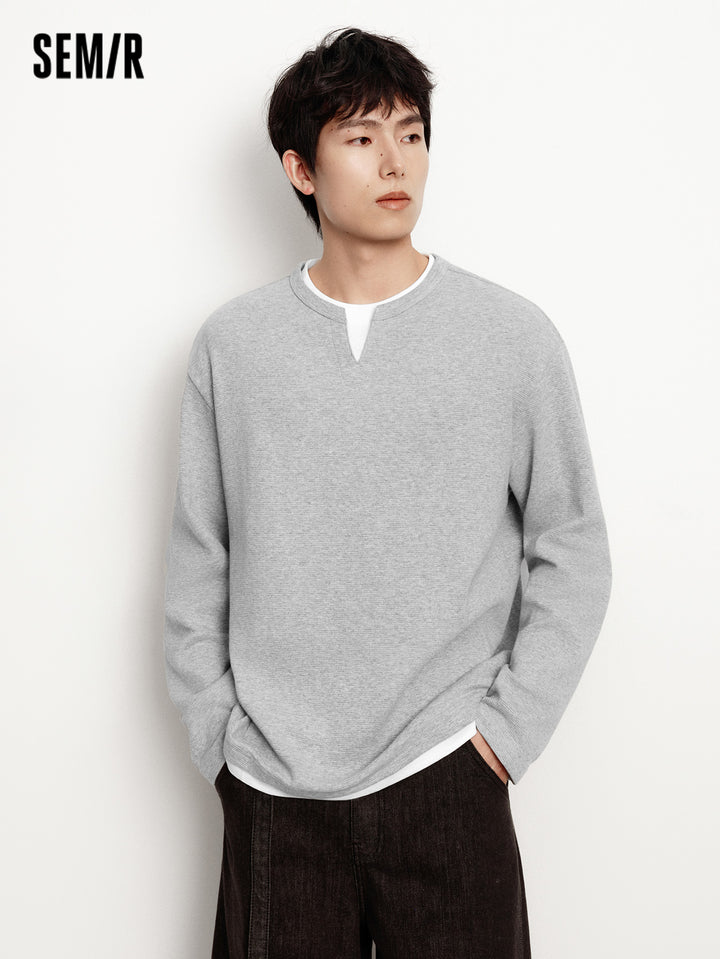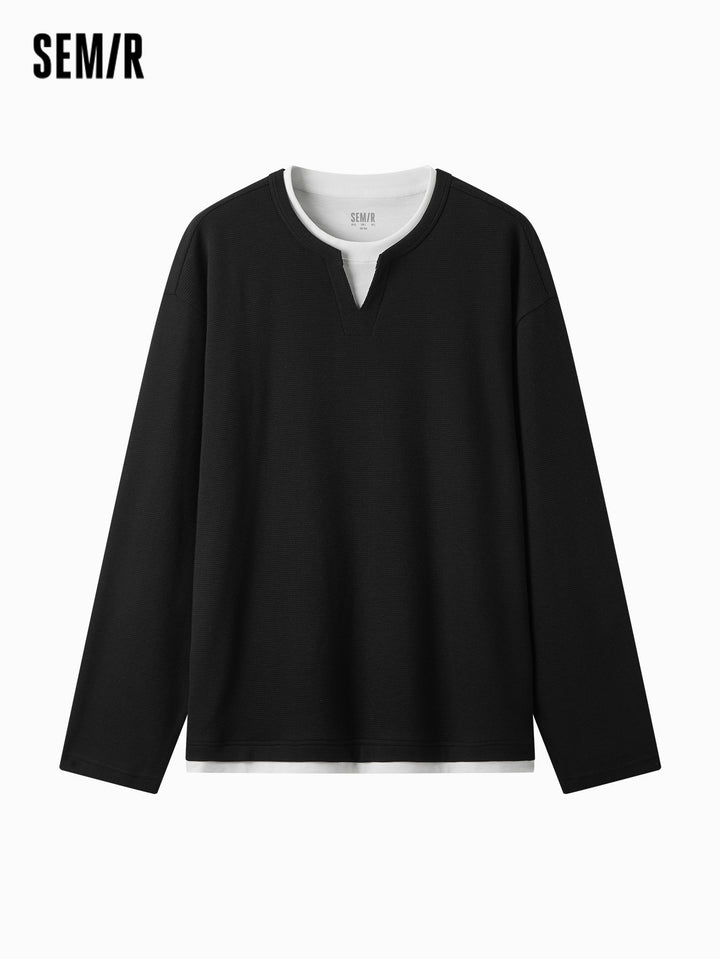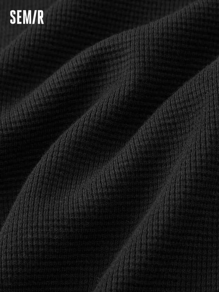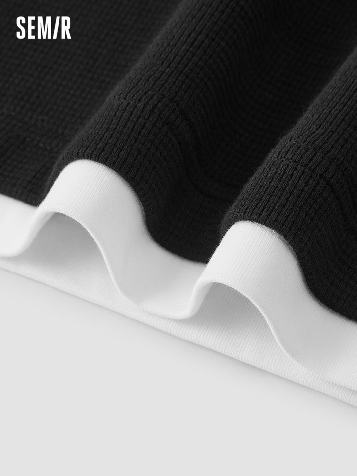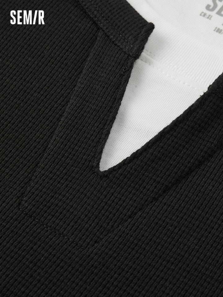 1. Basic versatile waffle-textured faux two-piece T-shirt; 2. 265G New Sugar cotton waffle, strong texture, structured; 3. Loose fit, fashionable and versatile; 4. Small V-neck combined with contrast round neck, hem contrast panels, creates faux two-piece layered effect; 5. Ribbed neckline binding, maintains shape.