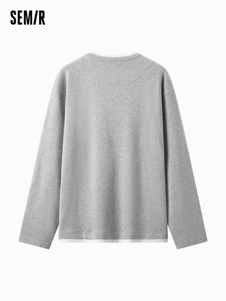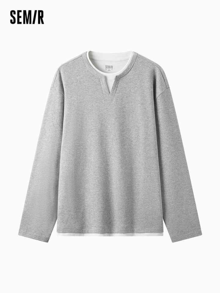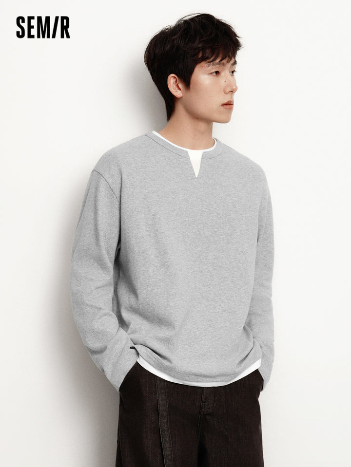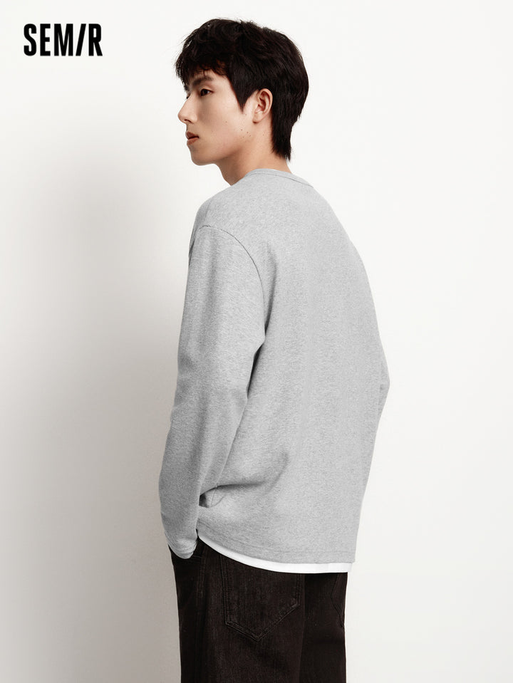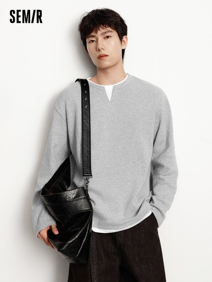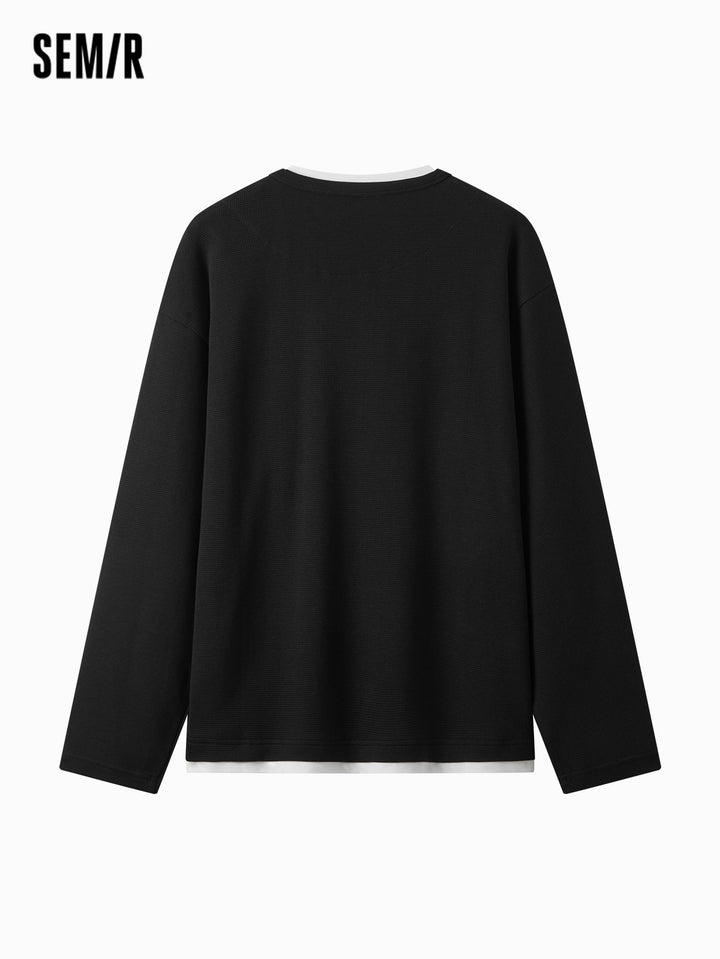 1. Basic versatile waffle-textured faux two-piece T-shirt; 2. 265G New Sugar cotton waffle, strong texture, structured; 3. Loose fit, fashionable and versatile; 4. Small V-neck combined with contrast round neck, hem contrast panels, creates faux two-piece layered effect; 5. Ribbed neckline binding, maintains shape.