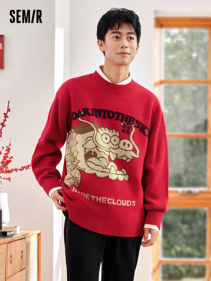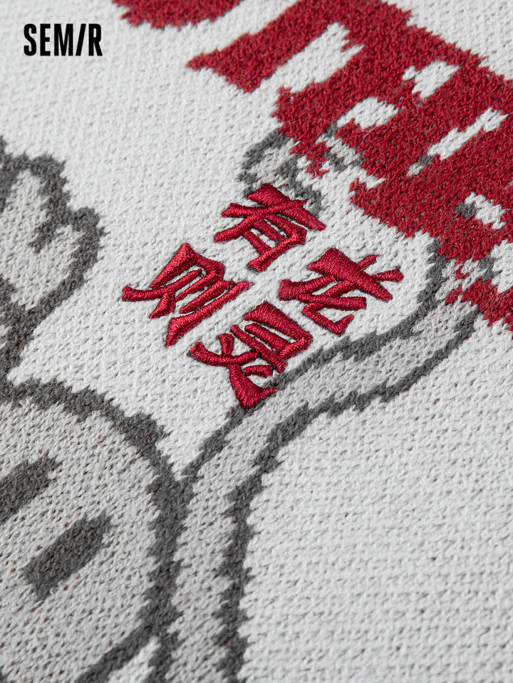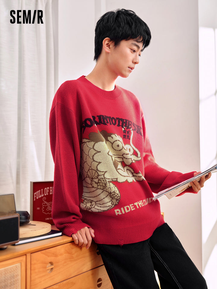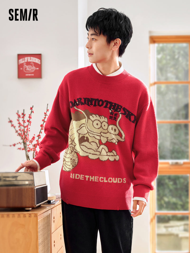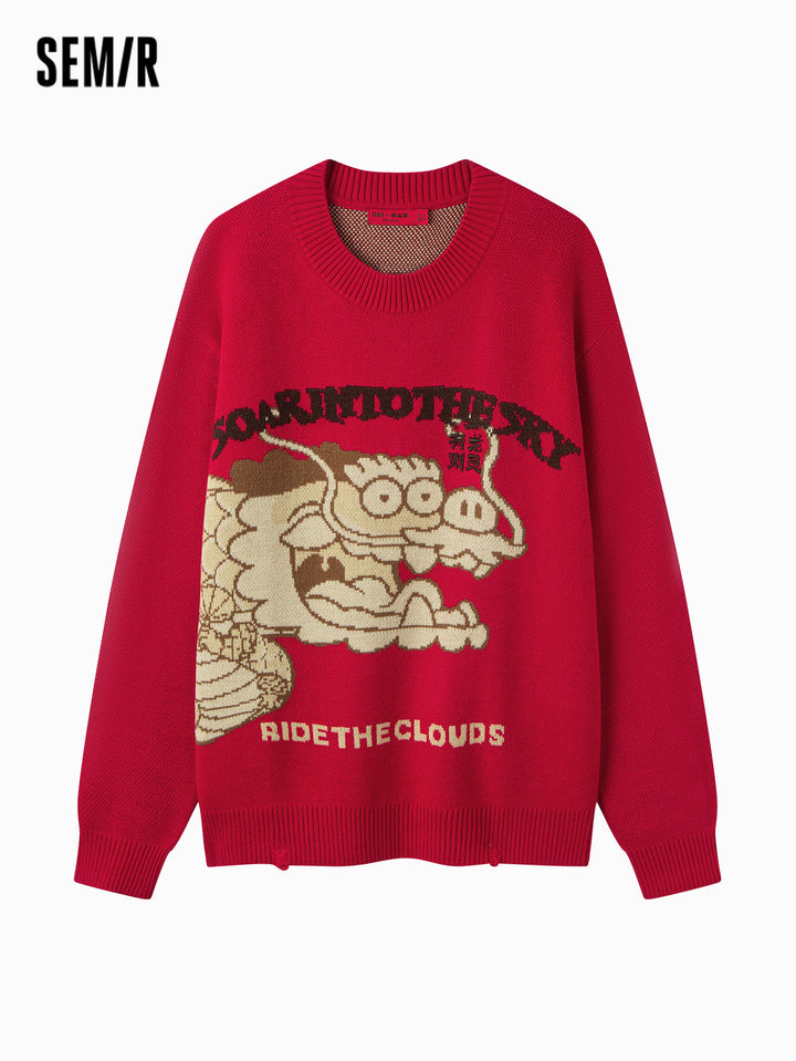 1. Unisex crewneck sweater from “Fat Dragon” collaboration; 2. Playful Fat Dragon jacquard with contrast lettering and 3D embroidery; distressed ribbed hem and cuffs add trendy streetwear flair; 3. Made of 100% anti-pilling acrylic, durable and long-lasting; 4. Relaxed fit, suitable for layering or standalone wear