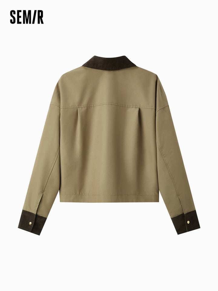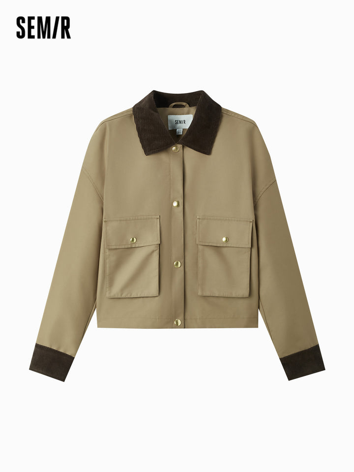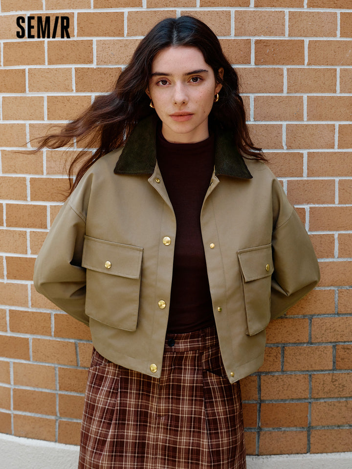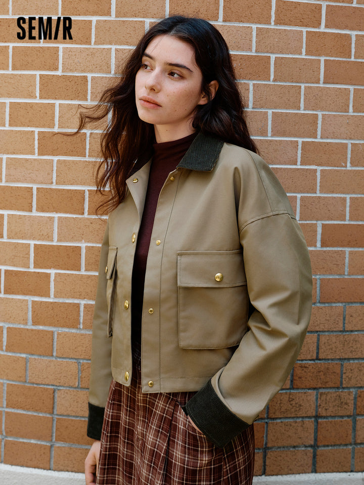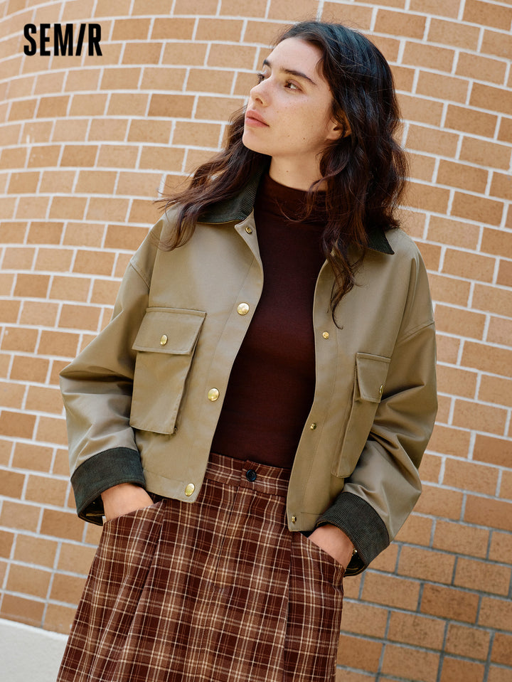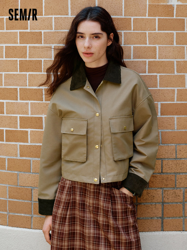 1. Air-washed polyester-cotton twill fabric; 2. Vintage collared jacket with corduroy collar detail, structured patch pockets, and refined metal snap buttons; 3. Available in classic solid and plaid options