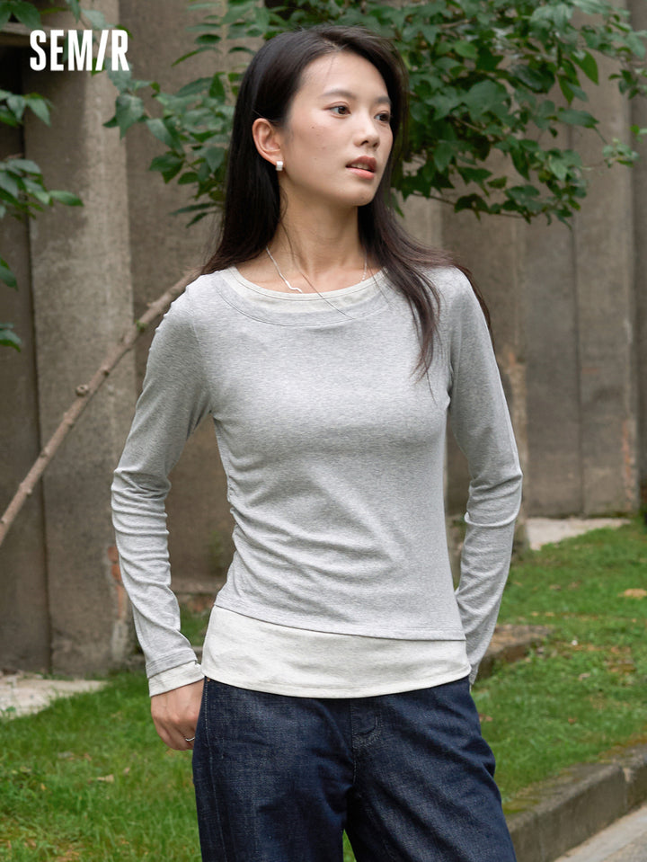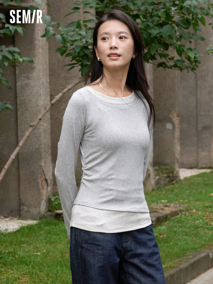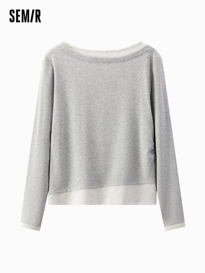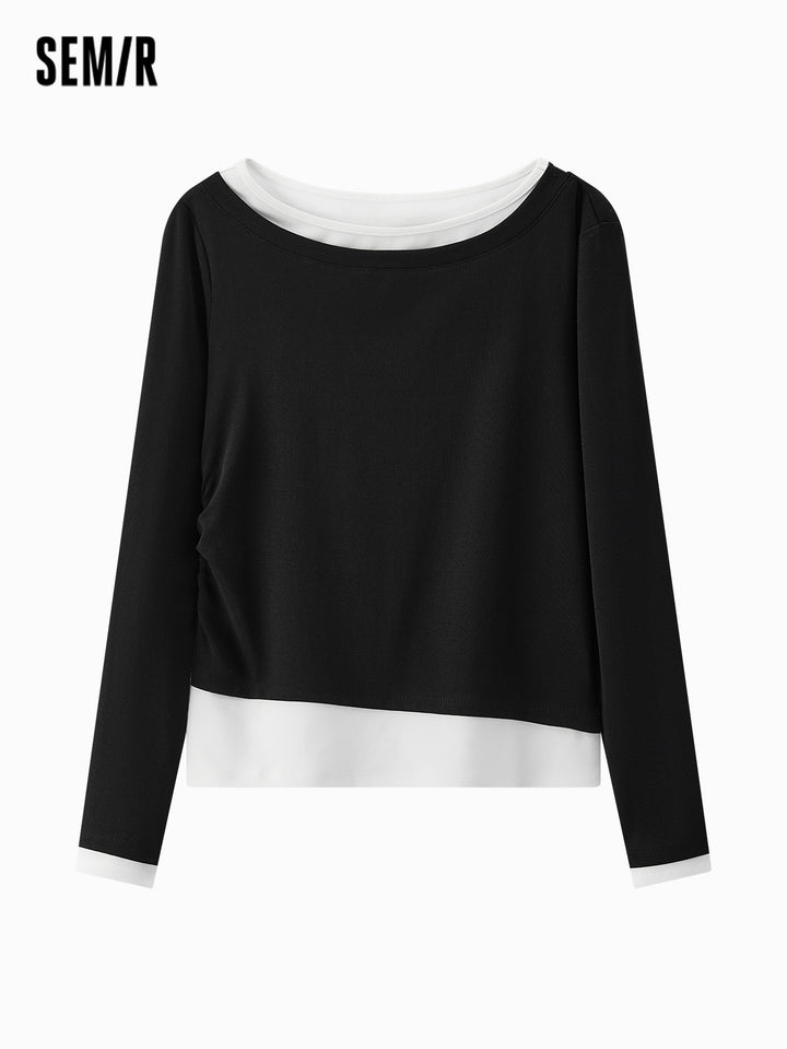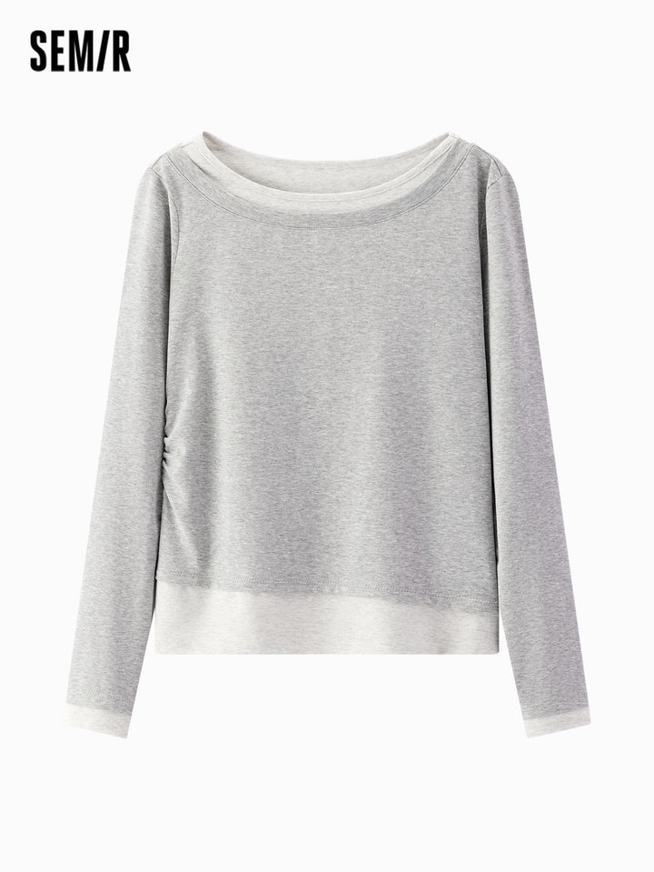 1. One faux two-piece slim T-shirt; 2. 1X1 modal cotton rib, soft and breathable, avoiding stuffiness; 3. Slim fit with single-side ruching, hides tummy and diverts attention; 4. Reinforced neckline with 0.6cm double topstitch, machine washable; 5. Classic base colors, versatile for multiple outfits; 6. Asymmetric faux two-piece design, easy styling, slim cut is flattering and neat, stylish worn alone