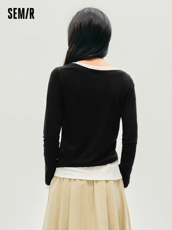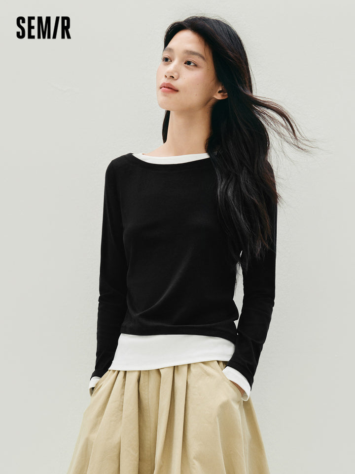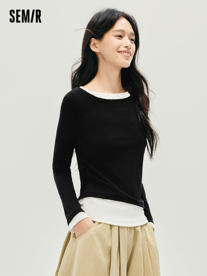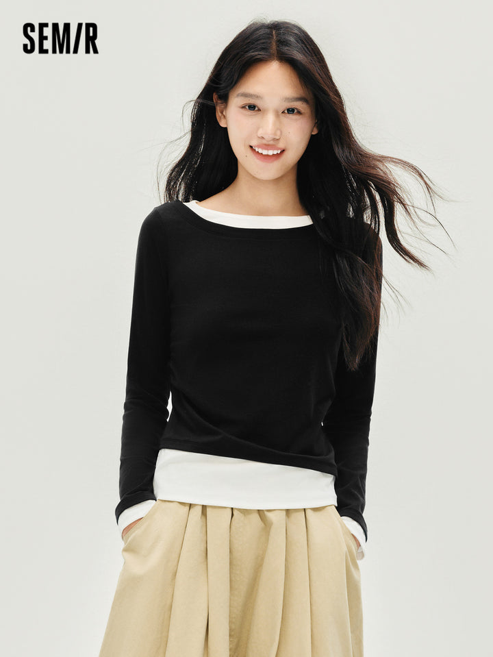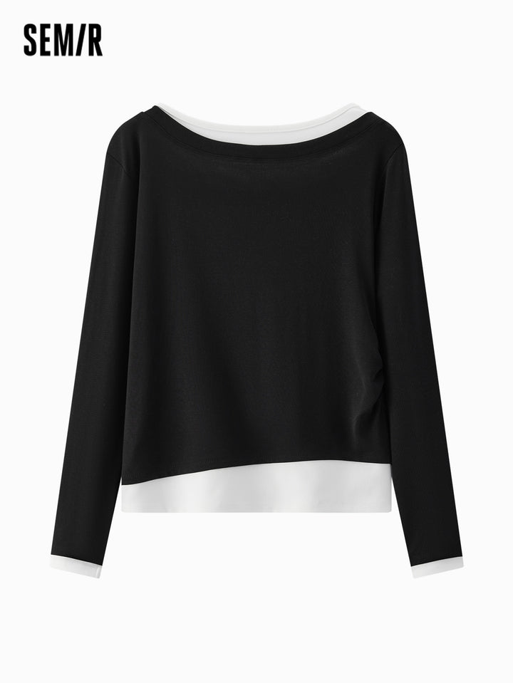 1. One faux two-piece slim T-shirt; 2. 1X1 modal cotton rib, soft and breathable, avoiding stuffiness; 3. Slim fit with single-side ruching, hides tummy and diverts attention; 4. Reinforced neckline with 0.6cm double topstitch, machine washable; 5. Classic base colors, versatile for multiple outfits; 6. Asymmetric faux two-piece design, easy styling, slim cut is flattering and neat, stylish worn alone