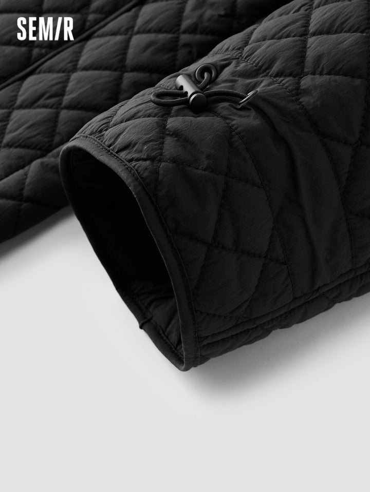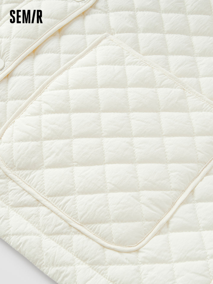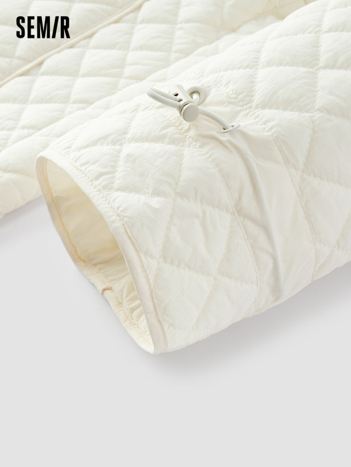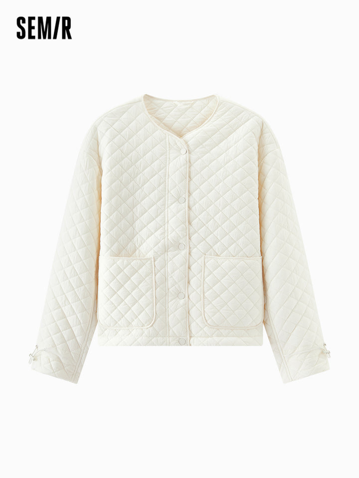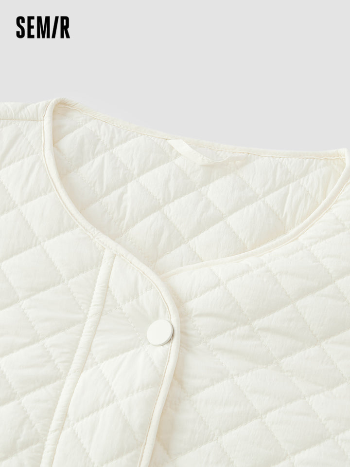 1. Collarless cotton jacket, versatile; 2. Ultrafine fiber fabric, 15D nylon, high-density weave, lightweight, back calendered, thin with texture; 3. Round-neck loose fit, small diamond quilt, 3D texture, adjustable hem drawstring, balances warmth and shape; 4. Thin cotton filling, lightweight and warm; 5. Off-white + black, classic and versatile; 6. Half drawstring cuffs enable dual wear, ruffle sleeves, double large side pockets combine storage and style.