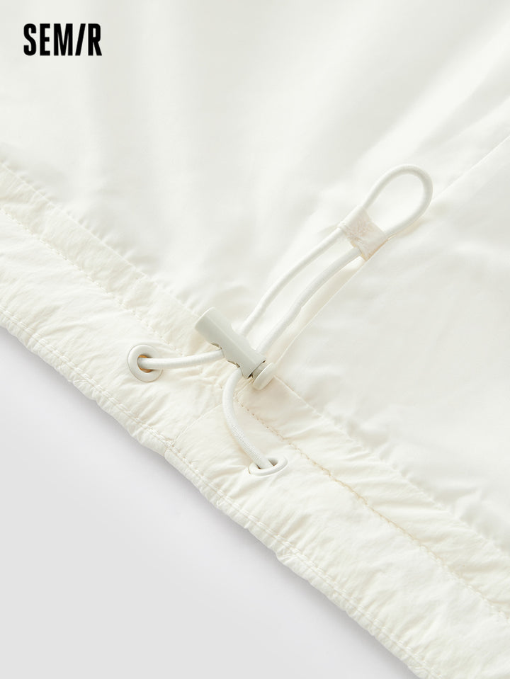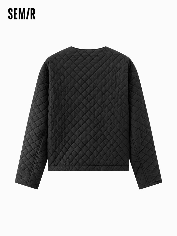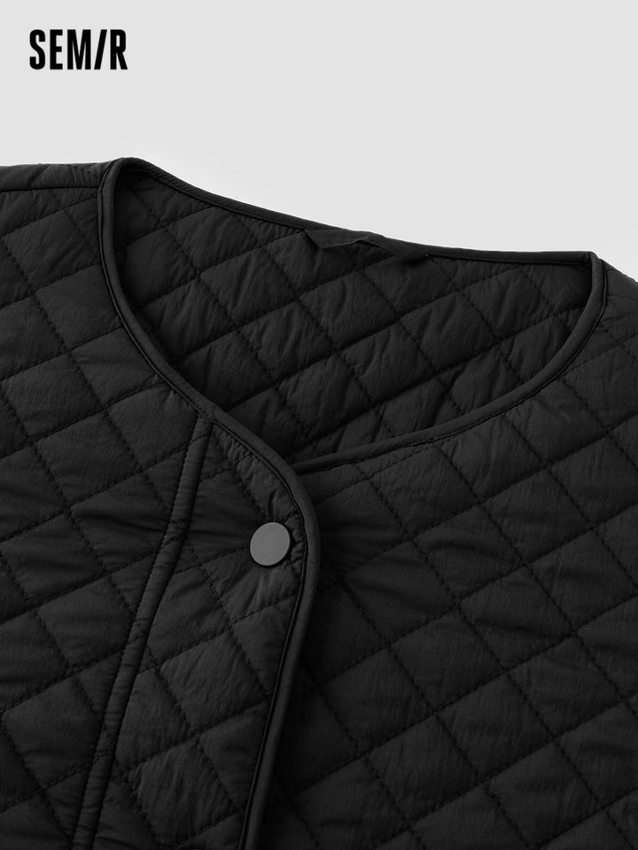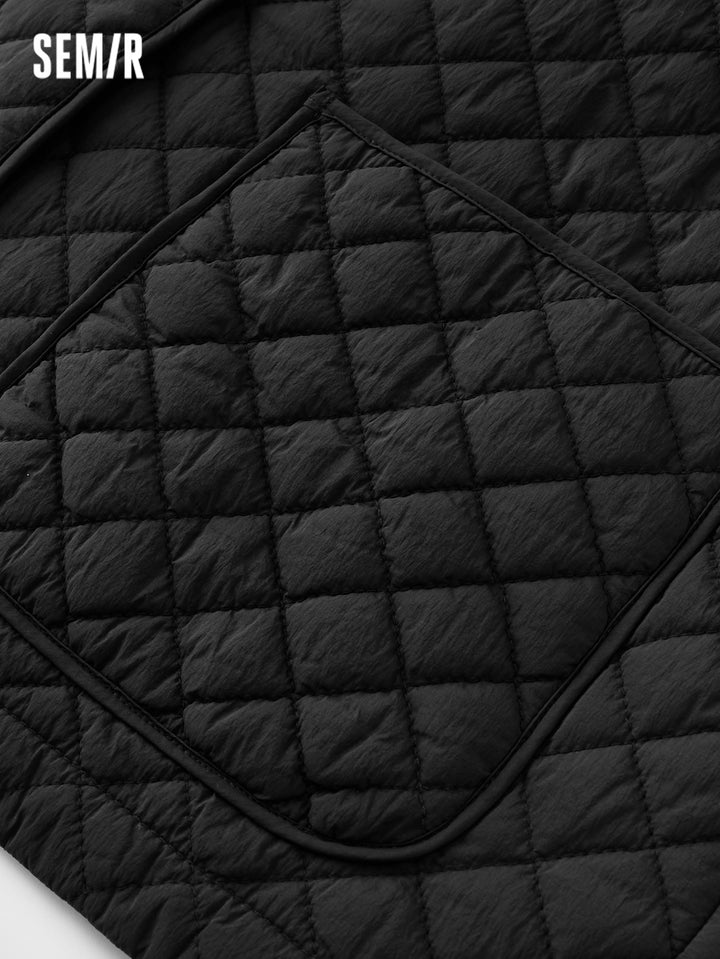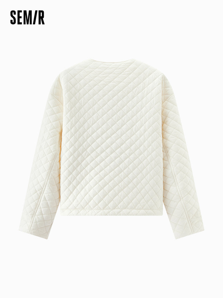 1. Collarless cotton jacket, versatile; 2. Ultrafine fiber fabric, 15D nylon, high-density weave, lightweight, back calendered, thin with texture; 3. Round-neck loose fit, small diamond quilt, 3D texture, adjustable hem drawstring, balances warmth and shape; 4. Thin cotton filling, lightweight and warm; 5. Off-white + black, classic and versatile; 6. Half drawstring cuffs enable dual wear, ruffle sleeves, double large side pockets combine storage and style.
