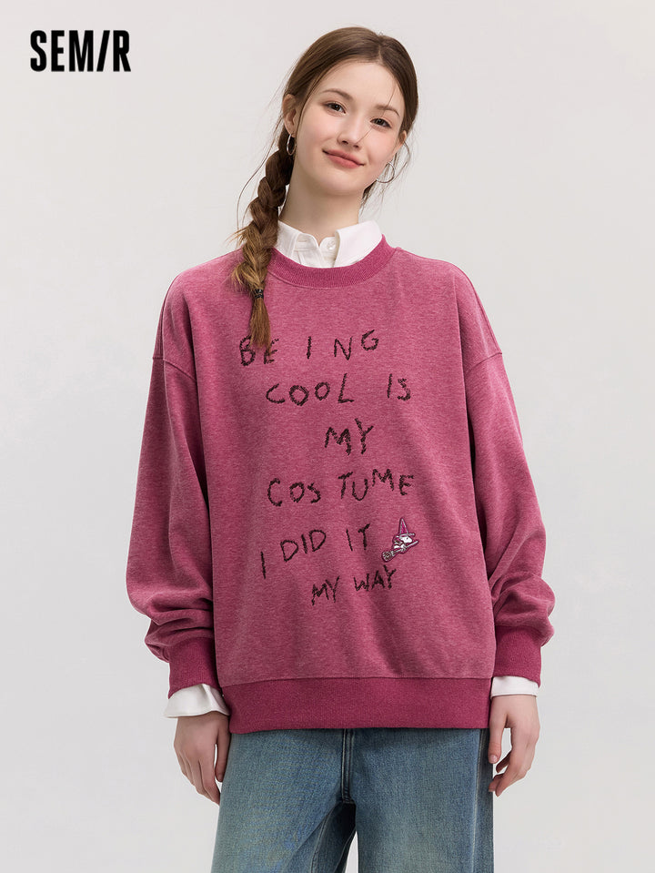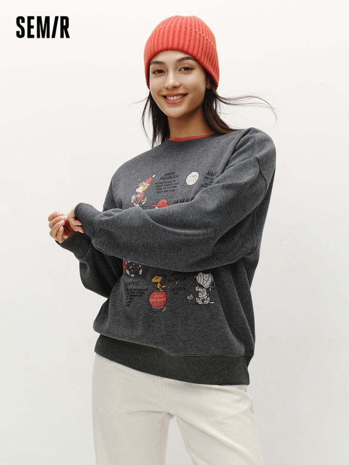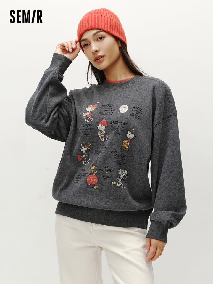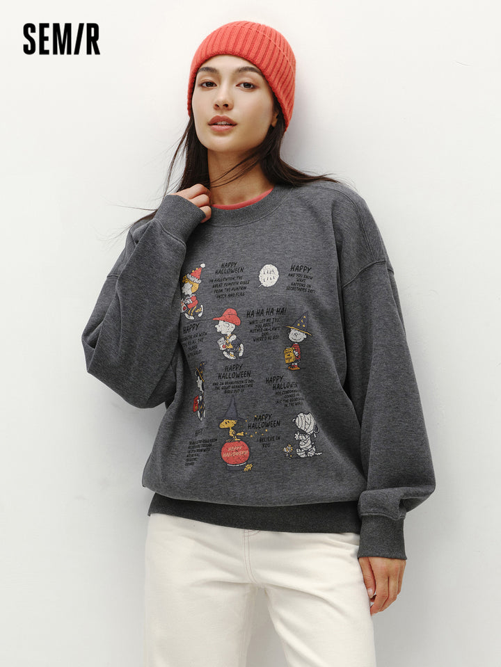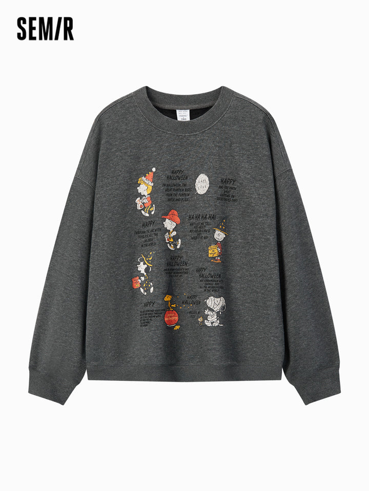 1. Colored flecked grey brushed fabric, different from ordinary sweatshirt fabric, adds trendy and marketable elements; 2. Snoopy Halloween “Trick or Treat” graphic with magic hat, printed with discharge method for vintage distressed dirty-fit look; 3. Multi-pattern design, different patterns use different techniques, offering multiple consumer options